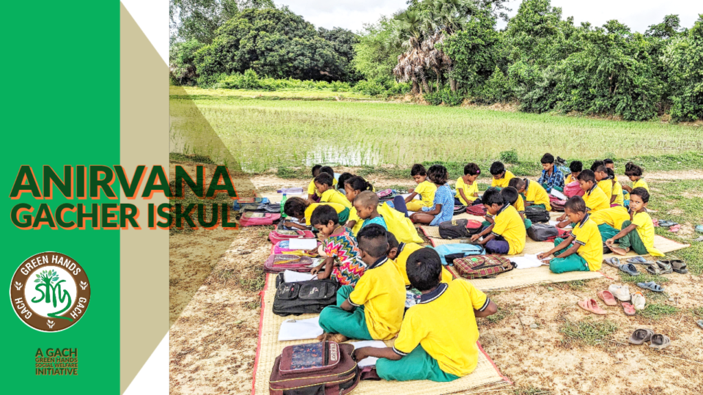 Amidst the pandemic hit time in 2021, an exodus of school drop outs was observed in various parts of rural India. Most of the Tribal communities couldn’t afford to provide their children with the luxury of virtual lessons. We tried our level best to provide an alternative to these children by constructing ‘Anirvana Gacher Iskul’, an open air school under the shades of trees. The idea behind the birth of the school was not only to keep the children under the purview of the formal education system, but also to develop them as environmentally sensitive human being. We started with 5 children and now the present strength is 80. The government schools were shut down. Mid-day-meal scheme also came to a standstill. Our trust took up the challenge of providing mid-day-meal to those children. We catered to the need of the children who belong to a tribal hamlet (Shamlapur in Bahadurpur area under block Farakka) in Murshidabad district of West Bengal. At present, as the classes happen in the morning hours, we provide simple breakfast to the children. Here we try to inculcate a basic sense of environmental awareness in the young learners from the very childhood.